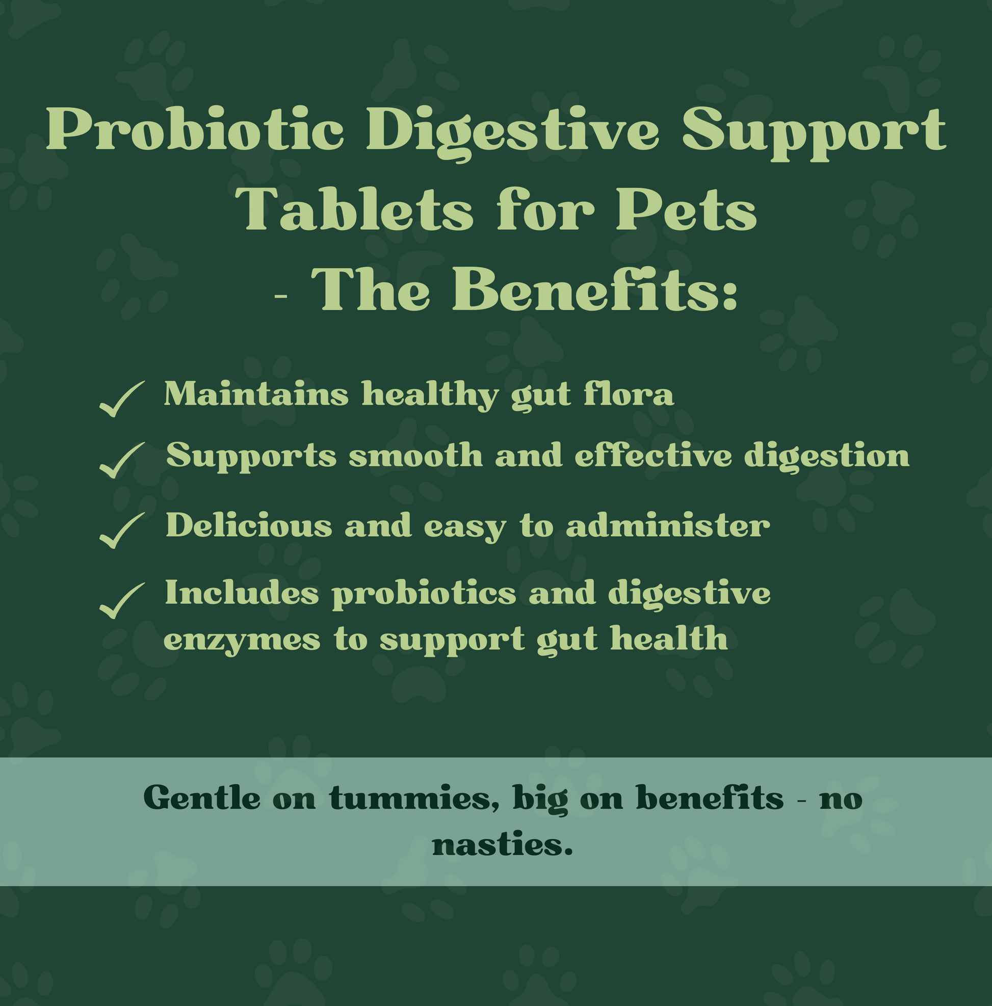 Each tablet includes Inulin from chicory root (a natural prebiotic), a five-strain live culture blend (Lactobacillus acidophilus, brevis, plantarum, rhamnosus, and Bifidobacterium lactis), and a 150mg digestive enzyme complex containing Amylase, Bromelain, Protease, Lipase, Cellulase, and Lactase. Flavoured with a yeast-based chicken coating for palatability.